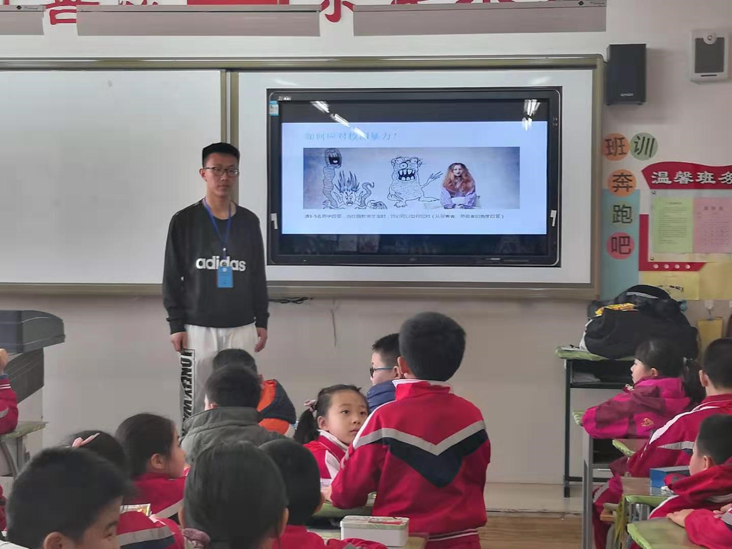 只見一個(gè)長(zhǎng)相魁梧的“歹徒”不僅擋住同學(xué)們回家的路,還口出狂言。而路過的幾名同學(xué)正不知所措。原來(lái)這是由北垣小學(xué)的師生們正在進(jìn)行校園暴力演習(xí),且當(dāng)天還邀請(qǐng)了52位律師走進(jìn)校園,為同學(xué)們上了一堂生動(dòng)的法律常識(shí)課。