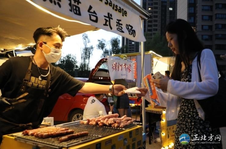 人間煙火氣,最撫凡人心。雖然已是21時許,但是后備廂集市依然人頭攢動,熱鬧非凡,叫賣聲不絕于耳。一家烤腸攤位前,攤主郭浩楠一邊招呼食客,一邊拿著夾子不緊不慢地翻動著烤架上的烤腸,烤好后拿竹簽一穿,伴著滋滋作響的聲音,紅光透亮的烤腸瞬間香氣四溢?!耙呀?jīng)參加了好幾場了,一晚上能售出近百根烤腸,不過我的初衷不是為了賺錢,就是想把自己鐘情的美食分享給大家?!惫崎f。