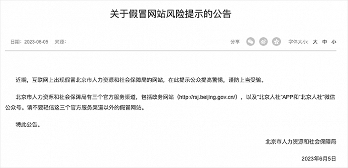 ·北京人社局就近期出現(xiàn)假冒網(wǎng)站發(fā)布風(fēng)險(xiǎn)提示。