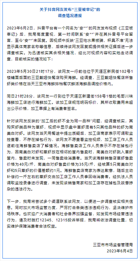 ·網(wǎng)友發(fā)布“三亞被宰記”,三亞通報(bào)調(diào)查情況。
