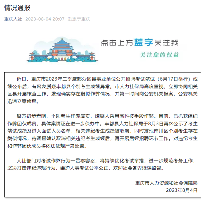 ·重慶通報(bào)事業(yè)單位招考作弊案:嫌疑人用高科技手段團(tuán)伙作弊,已抓獲組織作弊團(tuán)伙成員。