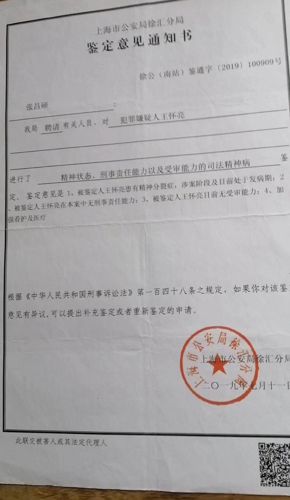 張宏銀回憶,他已經不記得這起依法不負刑事責任的精神病人強制醫(yī)療程序案件開庭審理的具體時間,只記得是2019年下半年的一天上午,那天犯罪嫌疑人沒有到場,律師也沒有到場,檢察院的兩位人員出席了開庭。徐匯區(qū)法院當庭做出判決:王懷亮被送往醫(yī)療機構進行強制醫(yī)療。2019年7月12日,張宏銀收到公安局的撤銷案件決定書。