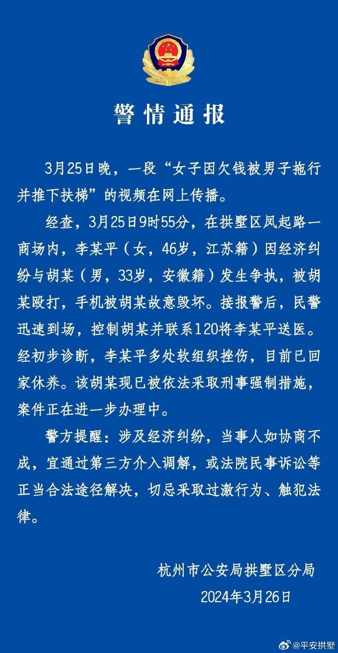 女子欠錢被男子拖下扶梯?杭州警方:涉經(jīng)濟(jì)糾紛 切忌采取過激行為