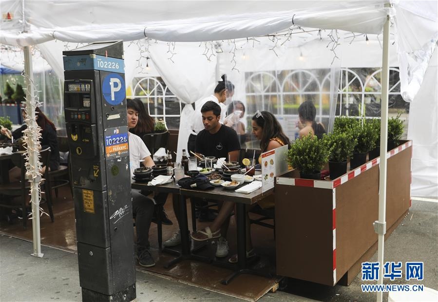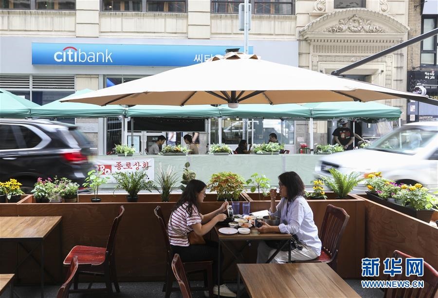 7月23日,在美國(guó)紐約,人們?cè)趹敉饩筒蛥^(qū)用餐。美國(guó)約翰斯·霍普金斯大學(xué)23日發(fā)布的新冠疫情最新統(tǒng)計(jì)數(shù)據(jù)顯示,美國(guó)累計(jì)確診病例超過400萬(wàn)例。數(shù)據(jù)顯示,截至美國(guó)東部時(shí)間23日15時(shí)34分(北京時(shí)間24日3時(shí)34分),美國(guó)累計(jì)確診病例4007859例,累計(jì)死亡病例143846例。新華社記者王迎攝