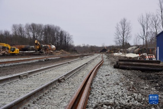 這是2月14日在美國俄亥俄州東巴勒斯坦鎮(zhèn)列車脫軌事故現(xiàn)場附近拍攝的鐵軌。新華社發(fā)(章焱飛攝)