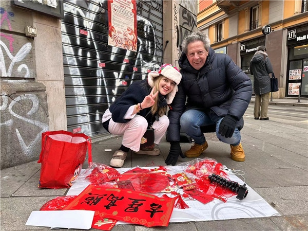 瑞麗和父親“老富”在米蘭街頭賣春聯(lián)。受訪者供圖