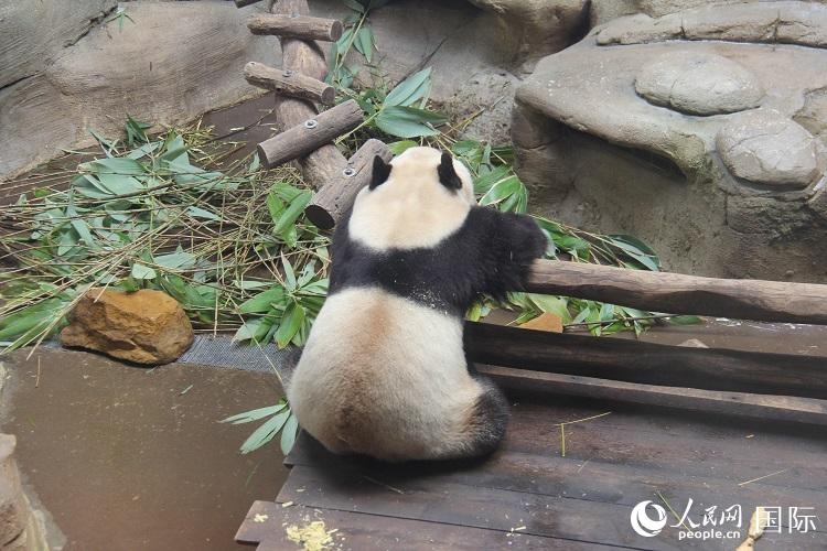 記者趕到時(shí),離開爸爸媽媽單獨(dú)生活的“圓夢(mèng)”正躺在木床上呼呼大睡,四仰八叉的可愛模樣吸引游客們紛紛駐足,拍照留念。動(dòng)物園工作人員介紹說,“圓夢(mèng)”現(xiàn)在已經(jīng)五歲多了,體重超過100公斤,身高也同成年大熊貓無差,活潑好動(dòng)、元?dú)鉂M滿。隨著飼養(yǎng)員往園內(nèi)投入新鮮的竹子,“圓夢(mèng)”也慢慢醒過來,開始享用竹子大餐。“我可以一整天在這里看它吃飯!真的太可愛了!這是我在動(dòng)物園最喜歡的動(dòng)物!”今年8歲的梅麗莎興奮地說。