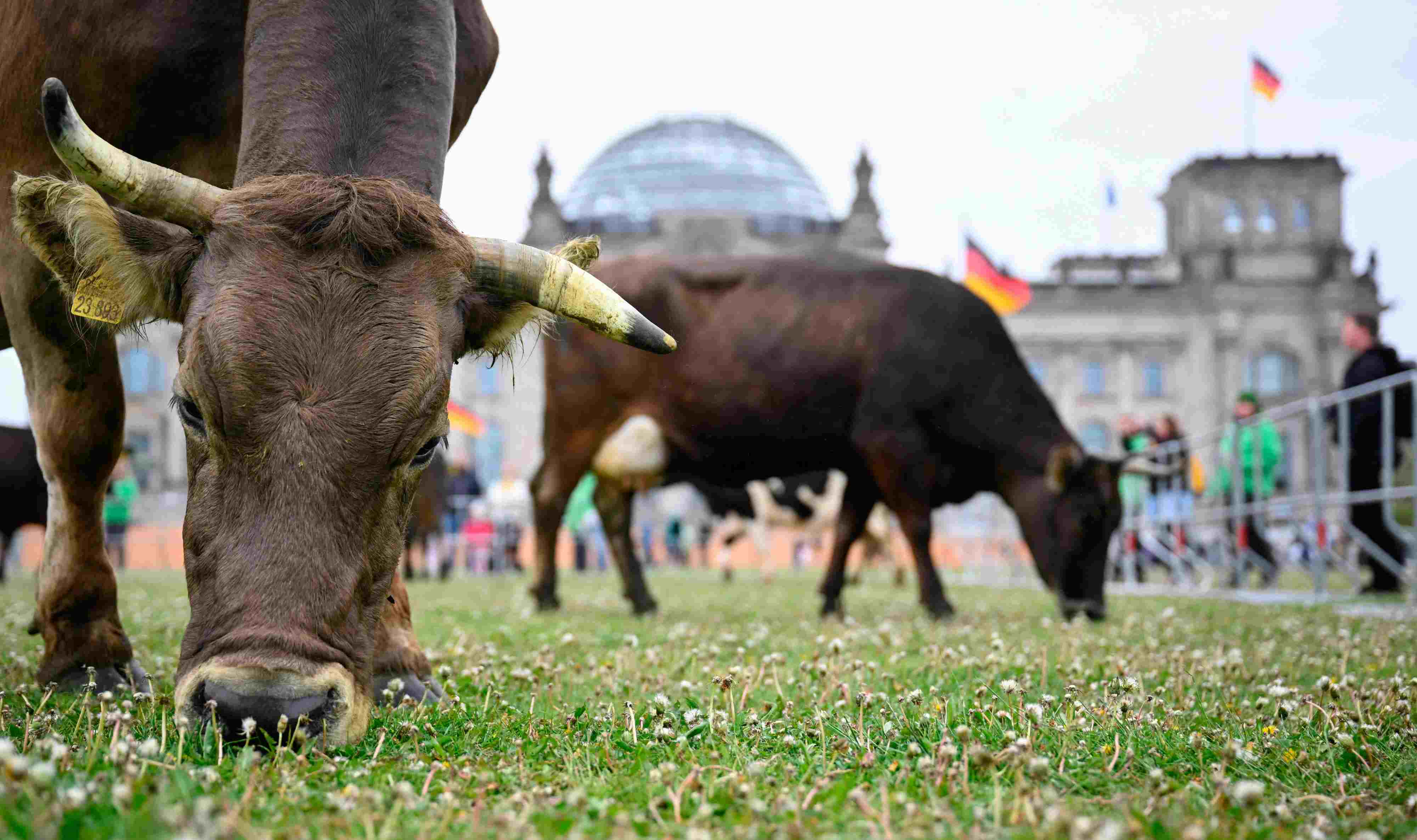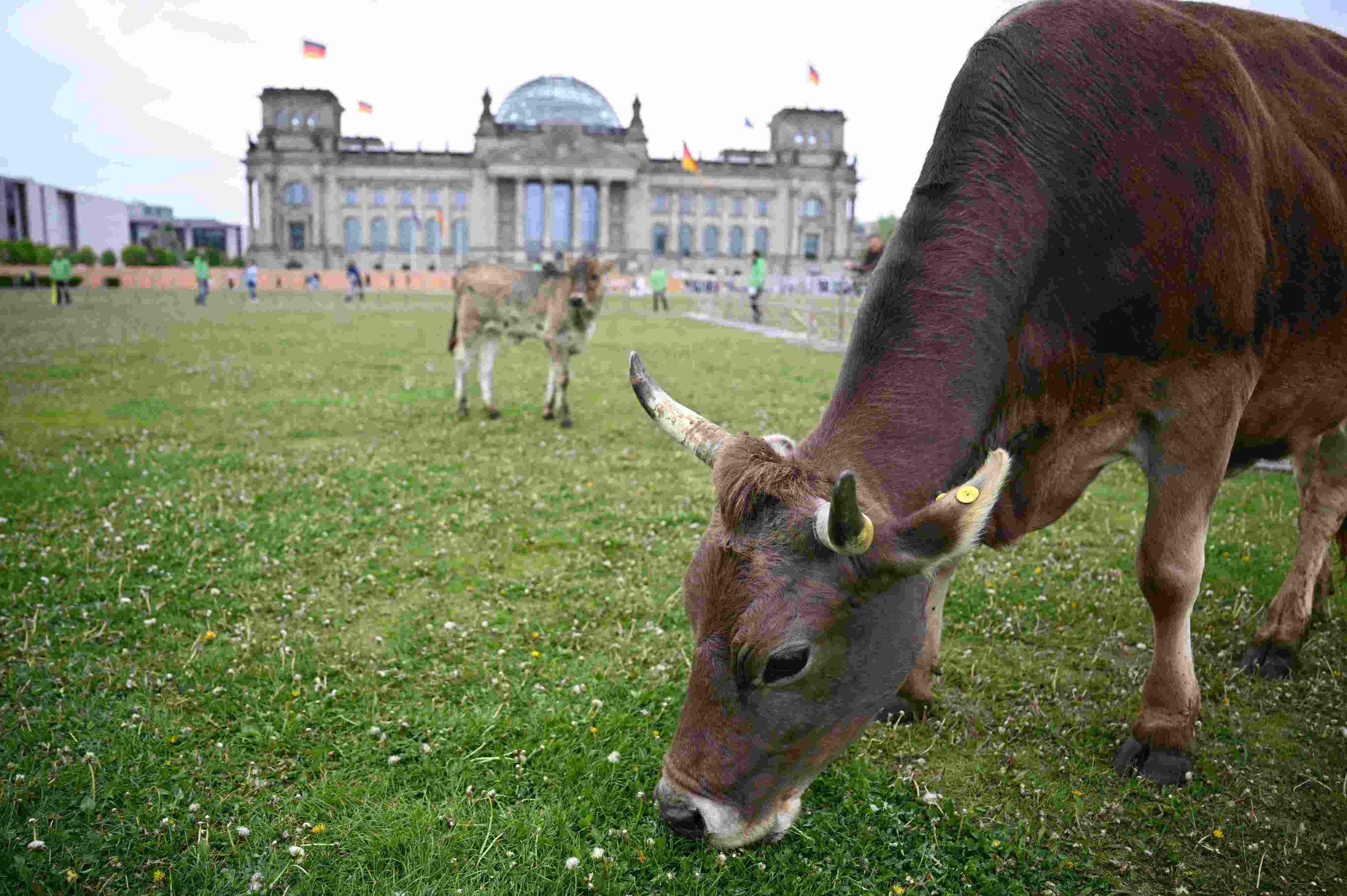 當(dāng)?shù)貢r(shí)間2023年5月16日,德國柏林,牛群被驅(qū)趕到國會(huì)大廈前吃草。活動(dòng)組織者希望通過這一行動(dòng),呼吁政治家們采取更多措施來促進(jìn)牧場(chǎng)農(nóng)業(yè)。 視覺中國