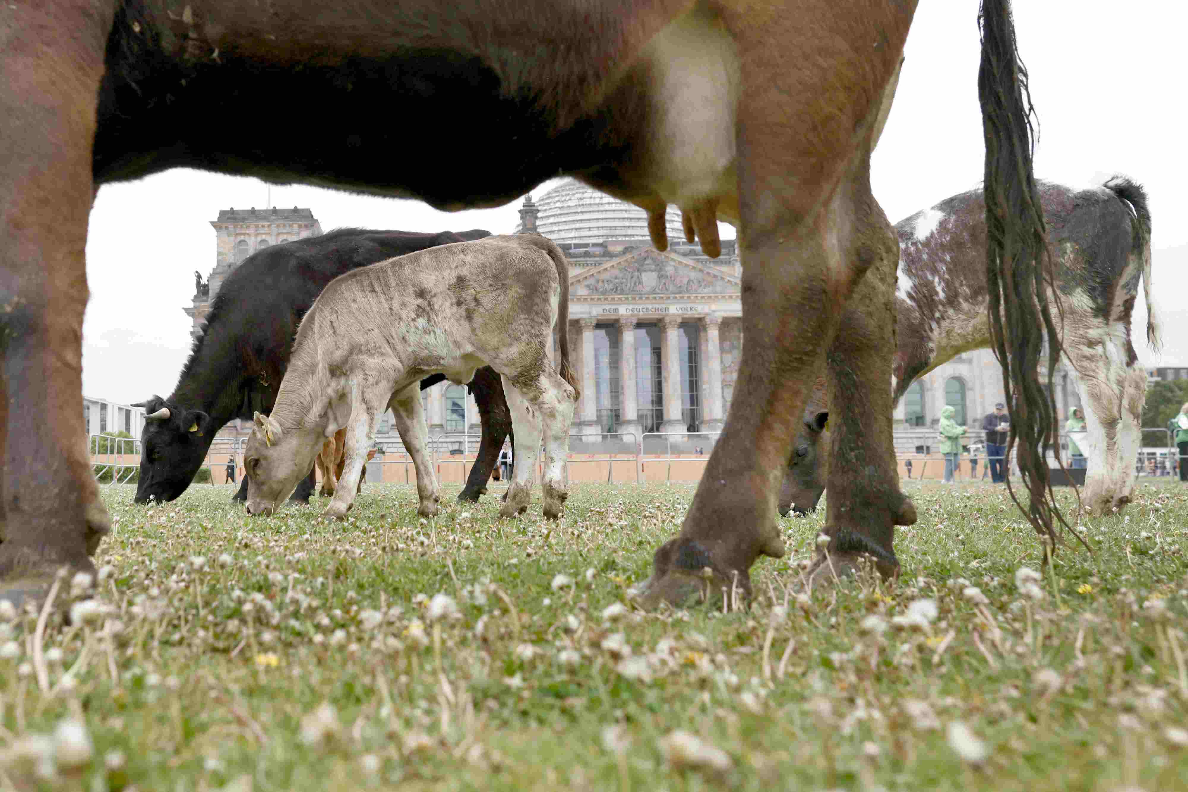 當(dāng)?shù)貢r(shí)間2023年5月16日,德國柏林,牛群被驅(qū)趕到國會(huì)大廈前吃草?;顒?dòng)組織者希望通過這一行動(dòng),呼吁政治家們采取更多措施來促進(jìn)牧場(chǎng)農(nóng)業(yè)。 視覺中國