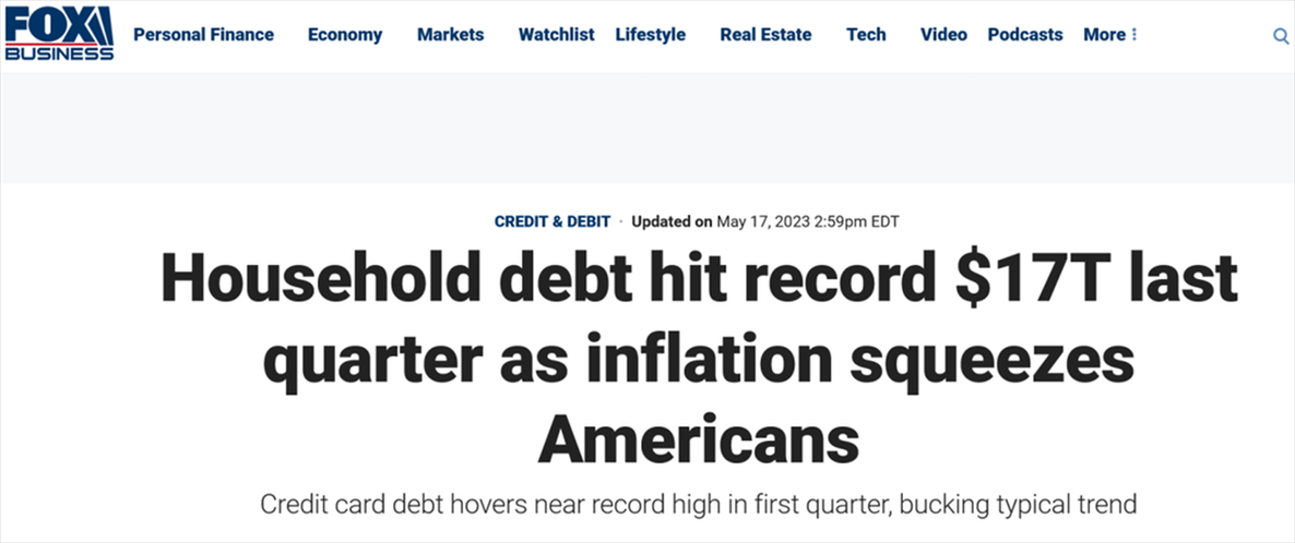 “通脹榨干了美國(guó)人,”對(duì)此,美國(guó)??怂剐侣劸W(wǎng)報(bào)道稱,“自2023年伊始,美國(guó)人的債臺(tái)更加高筑,有越來(lái)越多的美國(guó)家庭拖欠貸款。”