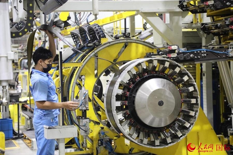 通用橡膠(泰國(guó))有限公司年產(chǎn)各類輪胎共計(jì)730萬套。圖為泰籍員工在汽車輪胎生產(chǎn)線上工作。人民網(wǎng)記者 孫廣勇攝