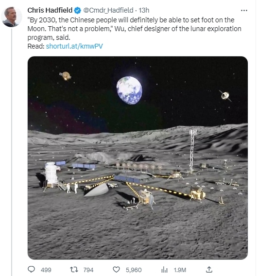 據(jù)報道,加拿大航天局前宇航員克里斯·哈德菲爾德在社交媒體推特上轉發(fā)了CGTN的一篇報道,他同時寫道,“中國探月工程總設計師吳偉仁說,‘到2030年,中國人的足跡一定能夠踏上月球。這不是個問題?!?/p>