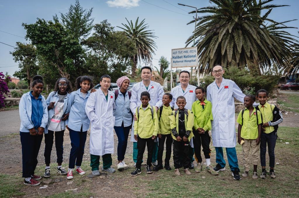 5月9日,在厄立特里亞首都阿斯馬拉的哈利貝特醫(yī)院門口,中國醫(yī)療隊(duì)隊(duì)員與附近學(xué)校兒童合影。新華社記者王冠森攝