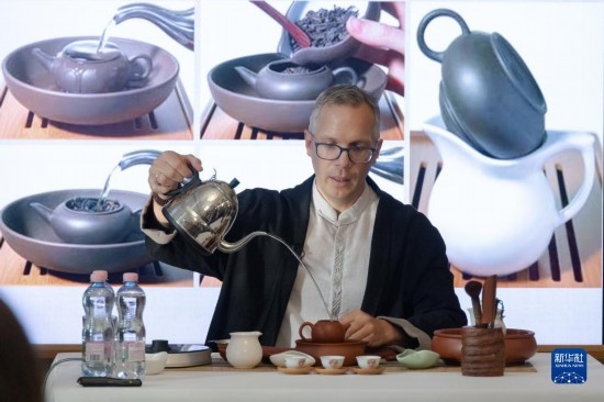 6月1日,在匈牙利布達(dá)佩斯,一名茶文化愛(ài)好者在“茶和天下·雅集”活動(dòng)上向嘉賓展示沖泡中國(guó)茶。新華社發(fā)(弗爾季·奧蒂洛攝)
