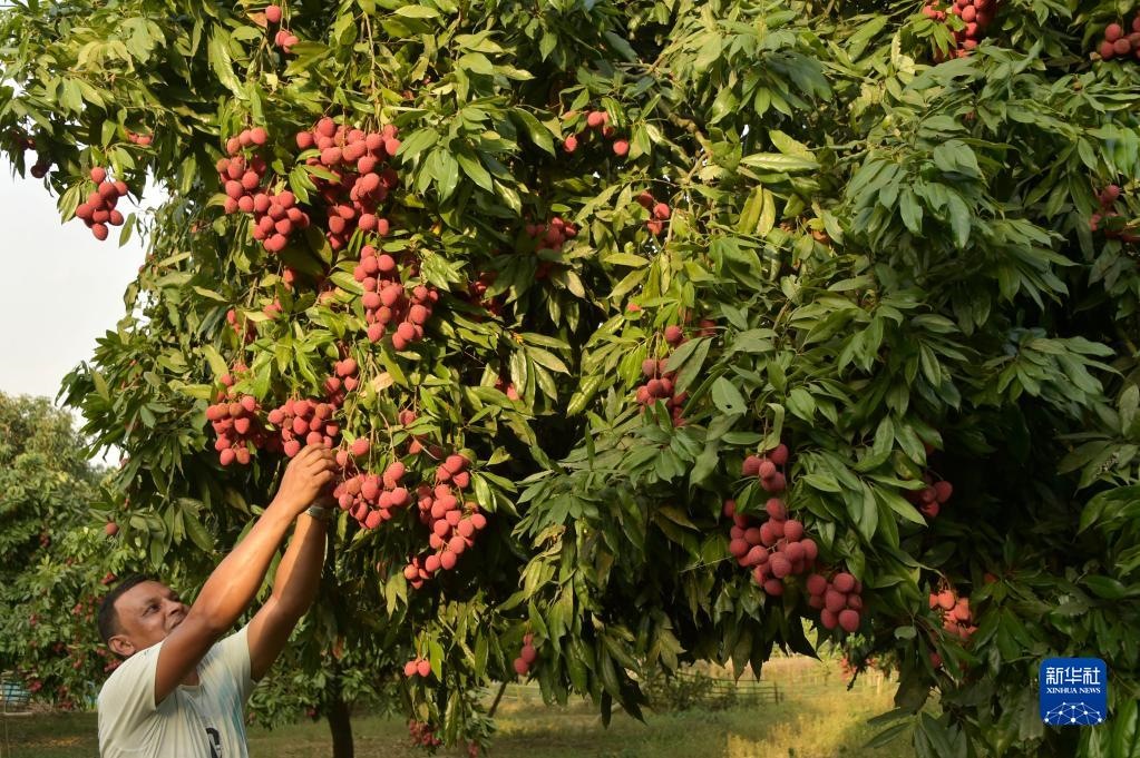 6月4日,農(nóng)民在孟加拉國(guó)迪納杰布爾的果園里采摘荔枝。新華社發(fā)