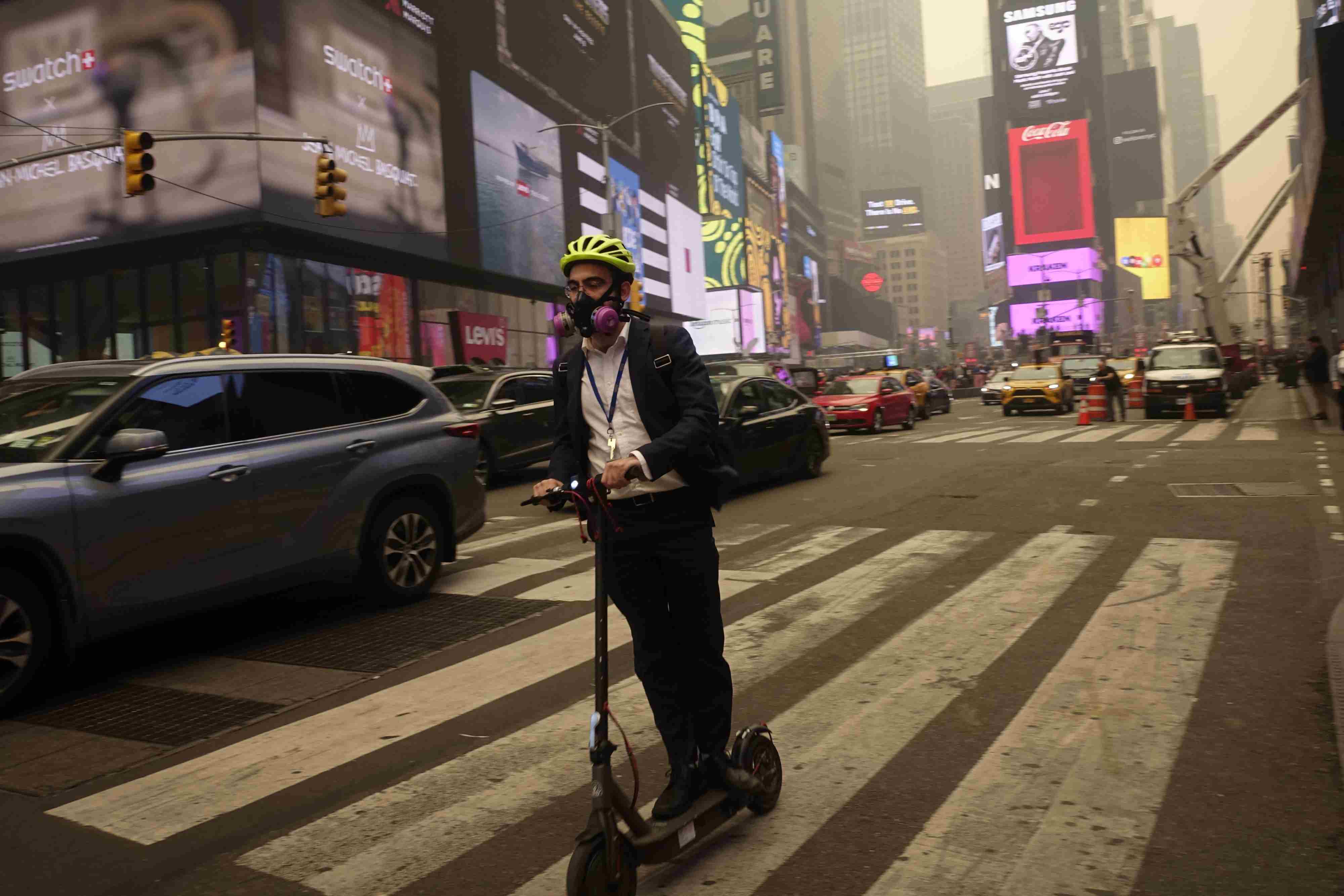 當?shù)貢r間6月7日,美國紐約時報廣場的一位騎行者佩戴著呼吸過濾器。近日,加拿大野火產(chǎn)生的煙霧蔓延至美國,紐約市出現(xiàn)霧霾,戶外民眾嚴密防護。 視覺中國