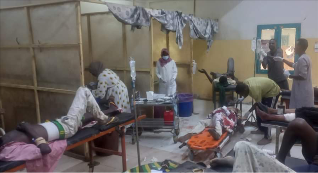 △喀土穆一市場(chǎng)遭空襲之后,在附近醫(yī)院救治的傷員