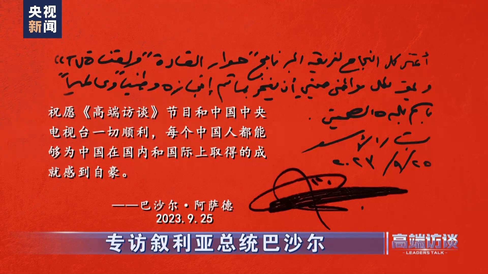 敘利亞總統(tǒng)巴沙爾在接受總臺(tái)專訪后題詞:祝愿《高端訪談》節(jié)目和中國(guó)中央電視臺(tái)一切順利,每個(gè)中國(guó)人都能夠?yàn)橹袊?guó)在國(guó)內(nèi)和國(guó)際上取得的成就感到自豪!