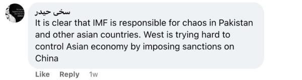 還有網(wǎng)友留言說:“國際貨幣基金組織對巴基斯坦和其他亞洲國家的混亂負有責任,這一點再清楚不過了。西方試圖通過制裁中國來控制亞洲經(jīng)濟。”