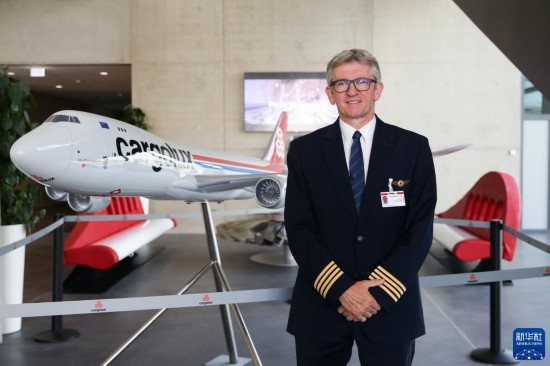 8月1日,在盧森堡貨航總部,盧森堡貨航飛行運(yùn)營執(zhí)行副總裁克洛德·澤倫站在貨機(jī)模型前。新華社記者 鄭煥松 攝