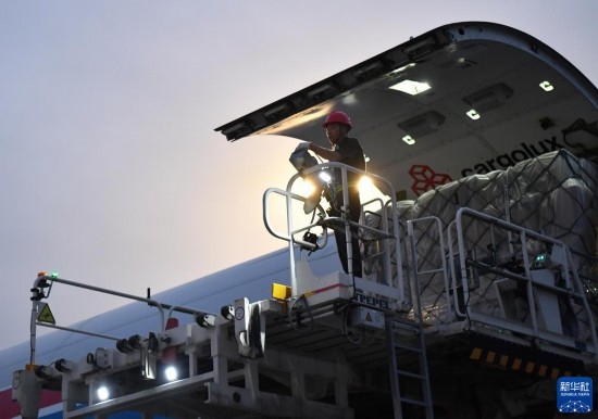 8月1日,工作人員在中國鄭州新鄭國際機(jī)場為一架盧森堡貨航貨機(jī)裝貨。新華社記者 李嘉南 攝