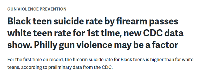 約翰斯·霍普金斯大學(Johns Hopkins University)最近的研究分析使用了2022年的初步統(tǒng)計數(shù)據(jù)進行計算,結果顯示,2022年全美總體槍支自殺率升至歷史最高水平。研究人員還發(fā)現(xiàn),黑人青少年的槍支自殺率首次超過了白人青少年。