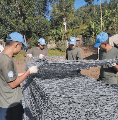 自去年9月部署到任務(wù)區(qū)以來(lái),第二十六批維和工兵分隊(duì)已完成32項(xiàng)工程任務(wù)、26項(xiàng)工程勘察,累計(jì)修筑道路52公里、搭建板房50間、構(gòu)筑圍墻2100米。今年5月,南基伍省卡萊亥地區(qū)遭受強(qiáng)降雨和洪水災(zāi)害,造成400多人死亡,上千座民居被沖毀。關(guān)鍵運(yùn)輸線路上的魯濟(jì)拉橋被洪水沖垮,切斷了人道主義援助物資的運(yùn)輸線,給當(dāng)?shù)孛癖娊煌ǔ鲂泻涂购榫葹?zāi)造成嚴(yán)重影響。工兵分隊(duì)接到任務(wù)后,第一時(shí)間奔赴災(zāi)區(qū)一線,在河邊安營(yíng)扎寨,執(zhí)行工程救援。7月,嶄新的魯濟(jì)拉橋已經(jīng)順利完工。