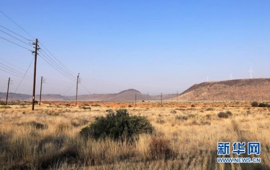 這是8月10日在南非北開普省德阿鎮(zhèn)拍攝的龍源南非公司德阿風(fēng)電項目風(fēng)機(jī)和輸電線路。 新華社記者 董江輝 攝
