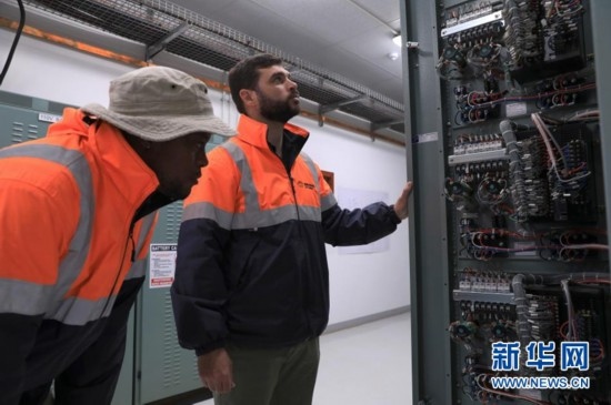 8月10日,在南非北開普省德阿鎮(zhèn),當(dāng)?shù)鼐用瘛⒆冸娬竟ぷ魅藛T達(dá)斯溫·巴松(左)與變電站副主管雷加特·范滕德在龍源南非公司德阿風(fēng)電項目變電站工作。新華社記者 董江輝 攝