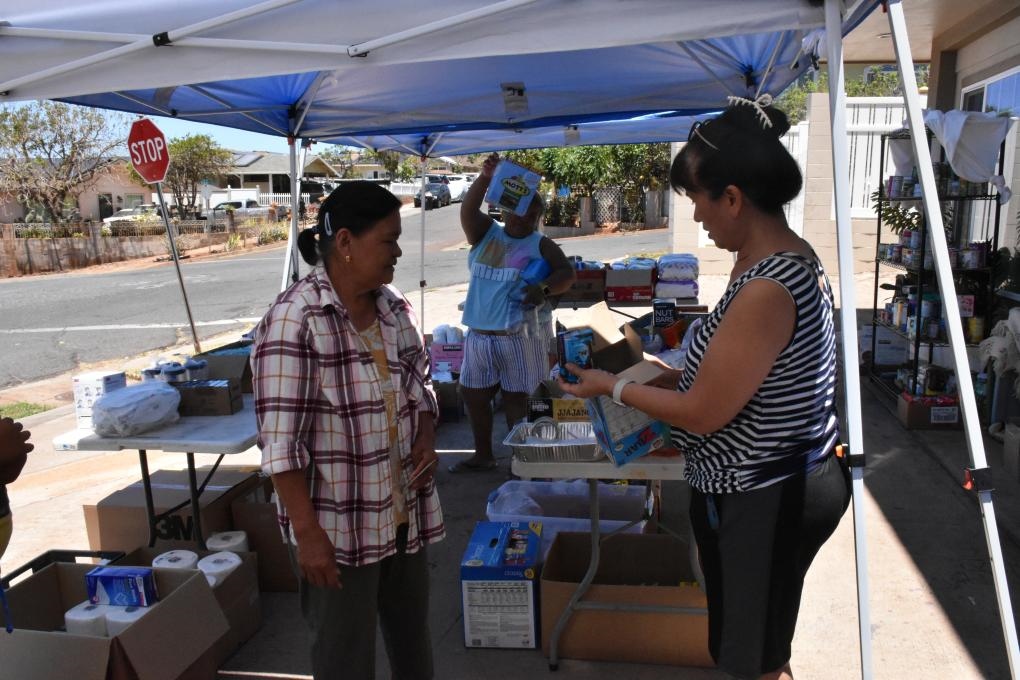 8月22日,在美國夏威夷州毛伊縣拉海納鎮(zhèn),埃爾琳達(dá)·拉梅布(右)分發(fā)救援物資。新華社發(fā)(曾慧攝)