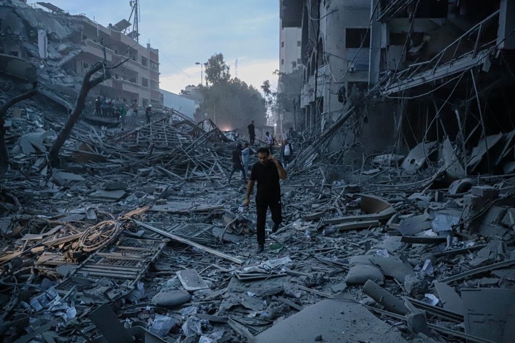 10月7日,加沙城的巴勒斯坦民眾查看以色列空襲后毀壞的民宅。(新華社發(fā),里澤克·阿卜杜勒賈瓦德攝)