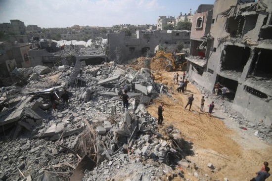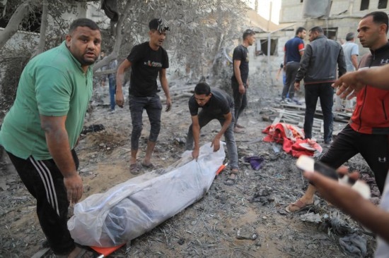 10月12日,在加沙地帶南部城市汗尤尼斯,人們?cè)谠庖陨锌找u后的建筑廢墟中抬出遇難者遺體。新華社發(fā)(亞西爾·庫(kù)迪攝)