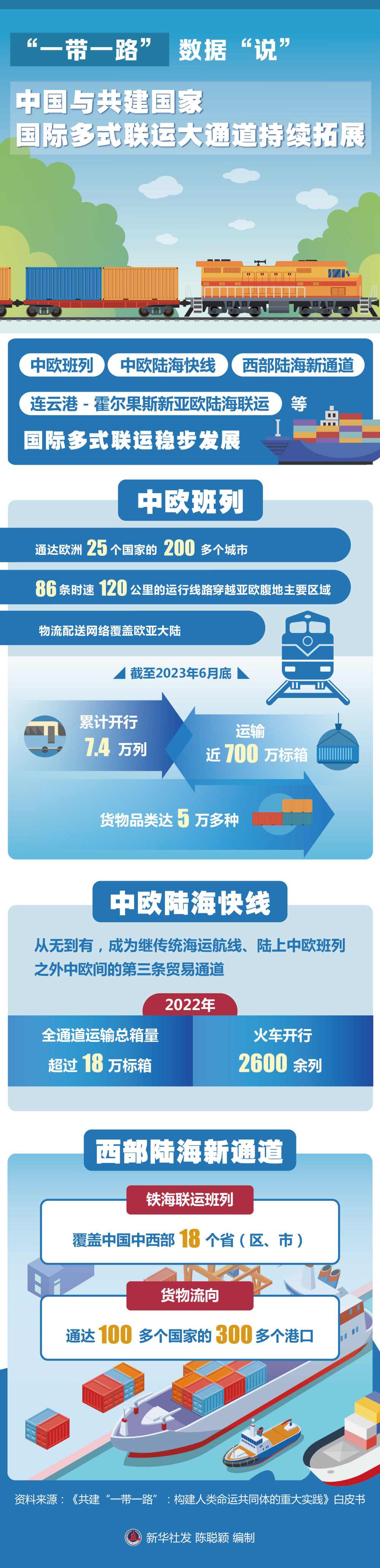 國(guó)際多式聯(lián)運(yùn)大通道持續(xù)拓展。中歐班列、中歐陸??炀€、西部陸海新通道、連云港-霍爾果斯新亞歐陸海聯(lián)運(yùn)等國(guó)際多式聯(lián)運(yùn)穩(wěn)步發(fā)展。中歐班列通達(dá)歐洲25個(gè)國(guó)家的200多個(gè)城市,86條時(shí)速120公里的運(yùn)行線路穿越亞歐腹地主要區(qū)域,物流配送網(wǎng)絡(luò)覆蓋歐亞大陸;截至2023年6月底,中歐班列累計(jì)開行7.4萬(wàn)列,運(yùn)輸近700萬(wàn)標(biāo)箱,貨物品類達(dá)5萬(wàn)多種,涉及汽車整車、機(jī)械設(shè)備、電子產(chǎn)品等53大門類,合計(jì)貨值超3000億美元。中歐陸海快線從無(wú)到有,成為繼傳統(tǒng)海運(yùn)航線、陸上中歐班列之外中歐間的第三條貿(mào)易通道,2022年全通道運(yùn)輸總箱量超過(guò)18萬(wàn)標(biāo)箱,火車開行2600余列。西部陸海新通道鐵海聯(lián)運(yùn)班列覆蓋中國(guó)中西部18個(gè)?。▍^(qū)、市),貨物流向通達(dá)100多個(gè)國(guó)家的300多個(gè)港口。