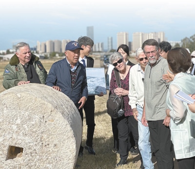 在云南昆明呈貢機場舊址,代表團一行聆聽講解員講述石碾背后的故事。呈貢機場曾是飛虎隊在昆明的主要基地之一,機場建設期間,當地人民拉動巨大石碾平整跑道,付出艱苦努力。本報記者 劉玲玲攝