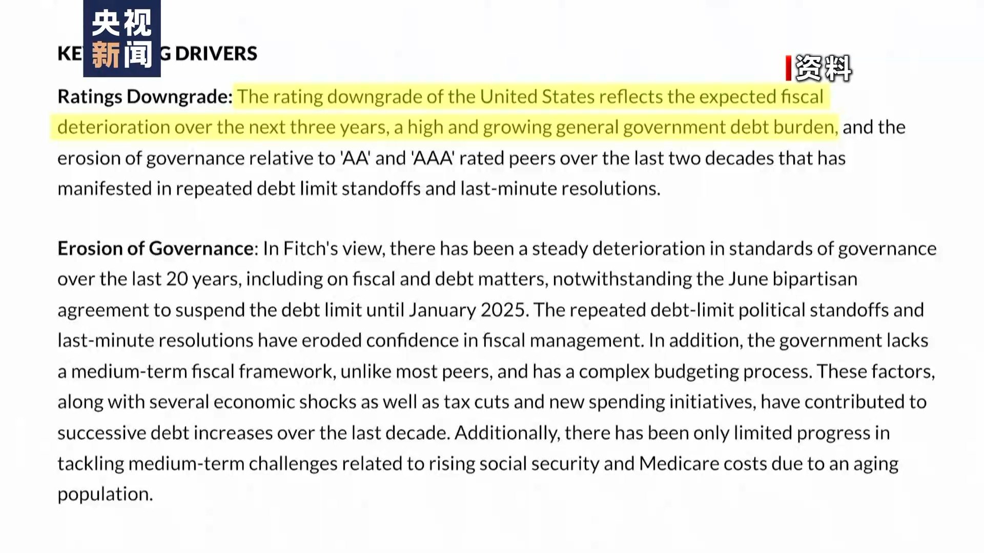 到了2023年8月1日,國際評(píng)級(jí)機(jī)構(gòu)惠譽(yù)將美國長期外幣發(fā)行人違約評(píng)級(jí)從AAA下調(diào)至AA+?;葑u(yù)當(dāng)天發(fā)表聲明說,下調(diào)美國信用評(píng)級(jí)主要由于美國政府債務(wù)負(fù)擔(dān)居高不下且不斷加重,未來3年財(cái)政狀況預(yù)計(jì)將持續(xù)惡化。
