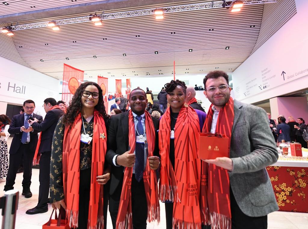 1月16日,在瑞士達沃斯,與會者在“大連之夜”招待會上合影。新華社記者連漪攝