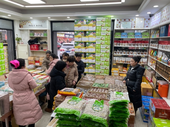 這是湖南長沙高橋大市場堅(jiān)果經(jīng)銷商李海麗在整理貨物。新華社記者 余春生 攝