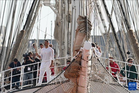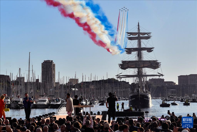 傍晚時(shí)分,伴隨著現(xiàn)場觀眾高唱法國國歌《馬賽曲》,“貝勒姆”號緩緩駛進(jìn)港口,著名的“法蘭西巡邏兵”飛行表演隊(duì)從港口上空呼嘯而過,先后展示了奧運(yùn)五環(huán)與法國國旗的圖案。
