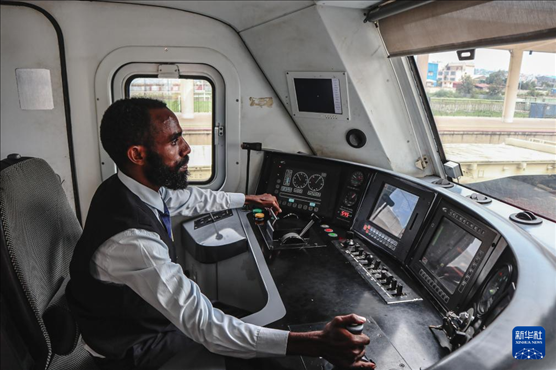 ?2024年5月10日,埃塞俄比亞火車司機(jī)在亞吉鐵路列車的駕駛室里工作。新華社記者 劉方強(qiáng) 攝