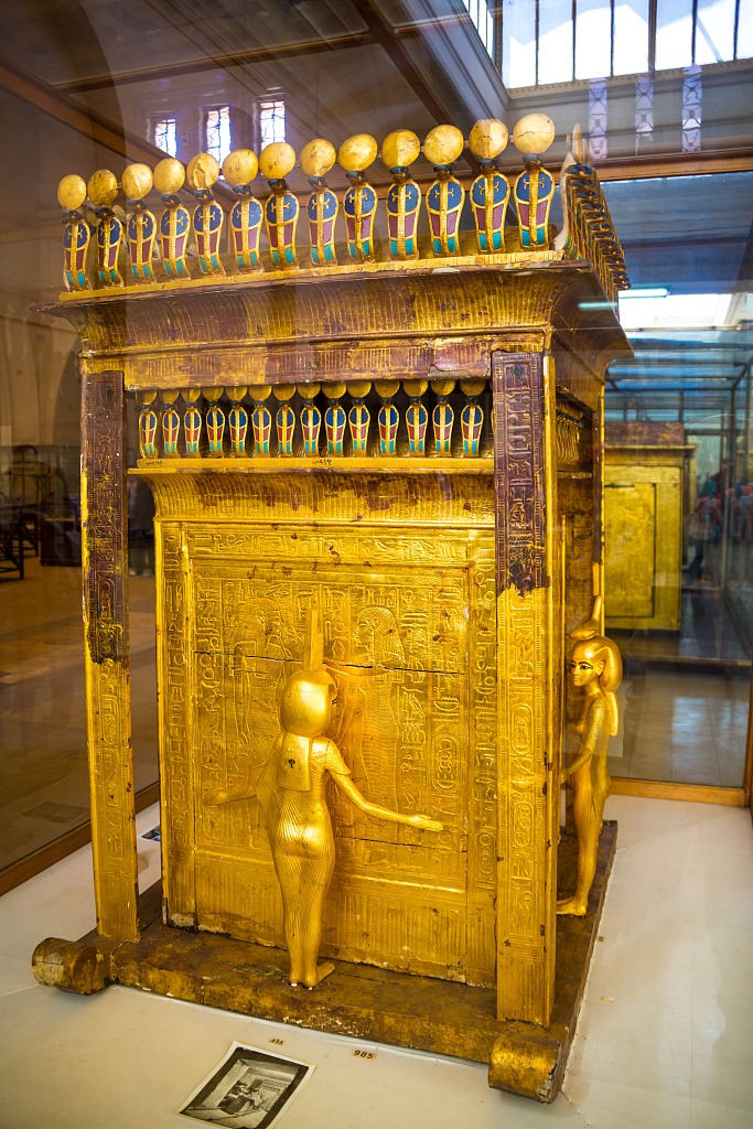 埃及博物館里陳列的圖坦卡蒙法老石棺最外層貼金橡木棺槨