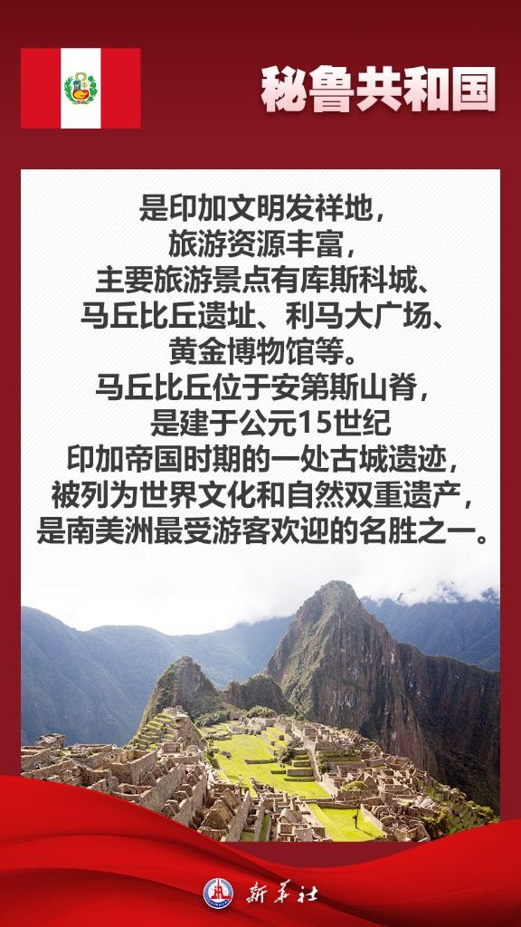 應(yīng)秘魯共和國總統(tǒng)博魯阿爾特邀請,國家主席習(xí)近平將于11月13日至17日赴利馬出席亞太經(jīng)合組織第三十一次領(lǐng)導(dǎo)人非正式會(huì)議并對秘魯進(jìn)行國事訪問。秘魯位于南美洲西部,是印加文明發(fā)祥地,也是最早同新中國建交的拉美國家之一。關(guān)于秘魯,七張海報(bào)帶你了解更多——