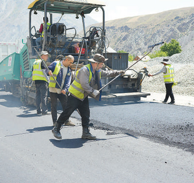 在中塔公路二期建設項目施工現(xiàn)場,工作人員正在鋪設瀝青。