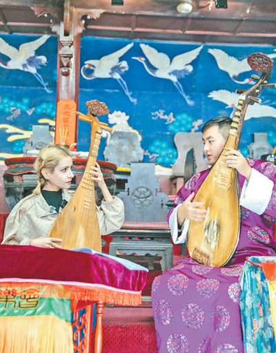 來自伊朗的游客在云南麗江大研納西古樂會(huì)學(xué)習(xí)古樂演奏。