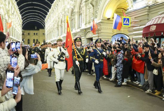 在4月29日和5月3日的夜間彩排中,中國方隊(duì)隊(duì)列整齊、精神飽滿,甫一亮相便引發(fā)轟動(dòng)。眾多俄羅斯民眾、在俄華僑華人和中國留學(xué)生聚集在紅場附近,爭相觀看。