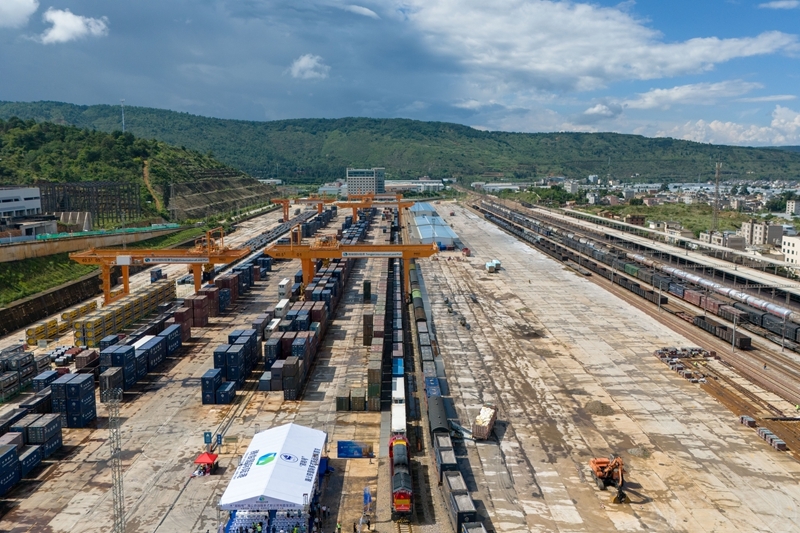 7月4日,“鄭和號”海公鐵國際多式聯(lián)運班列首發(fā)列車在昆明市騰俊國際陸港公鐵聯(lián)運中心等候發(fā)車。