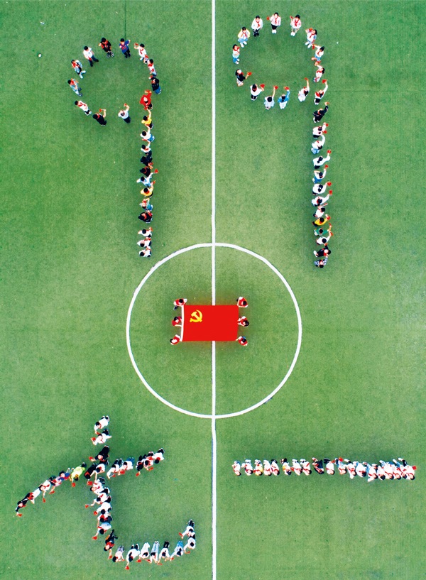 2020年6月30日,江蘇省泰州市大馮中心小學(xué)開展“童心向黨迎七一”主題班會,通過給學(xué)生上黨課、講黨史等方式,讓學(xué)生了解黨的光輝歷程,迎接中國共產(chǎn)黨建黨99周年。圖為活動中擺出的“七一”、“99”和黨旗的組合圖案。中新社發(fā)湯德宏/攝