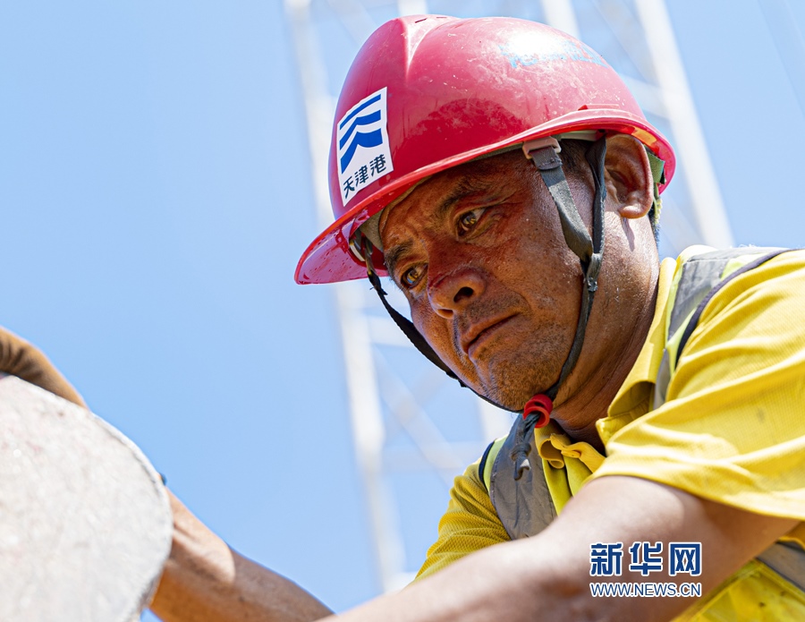 烈日下,建設(shè)工人在天津港c段智能化集裝箱碼頭建設(shè)現(xiàn)場進行安裝樁體工作。新華網(wǎng)發(fā)