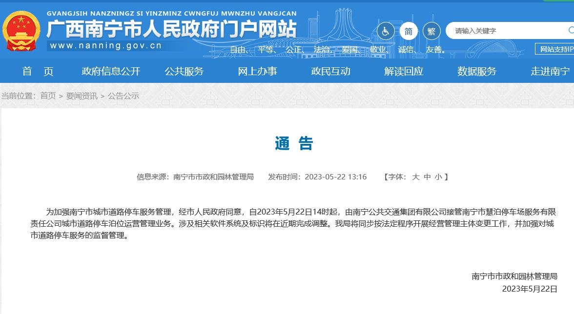 5月22日14時起 南寧公交集團(tuán)接管慧泊停車運(yùn)營管理業(yè)務(wù) 經(jīng)市人民政府同意,自2023年5月22日14時起,由南寧公共交......
