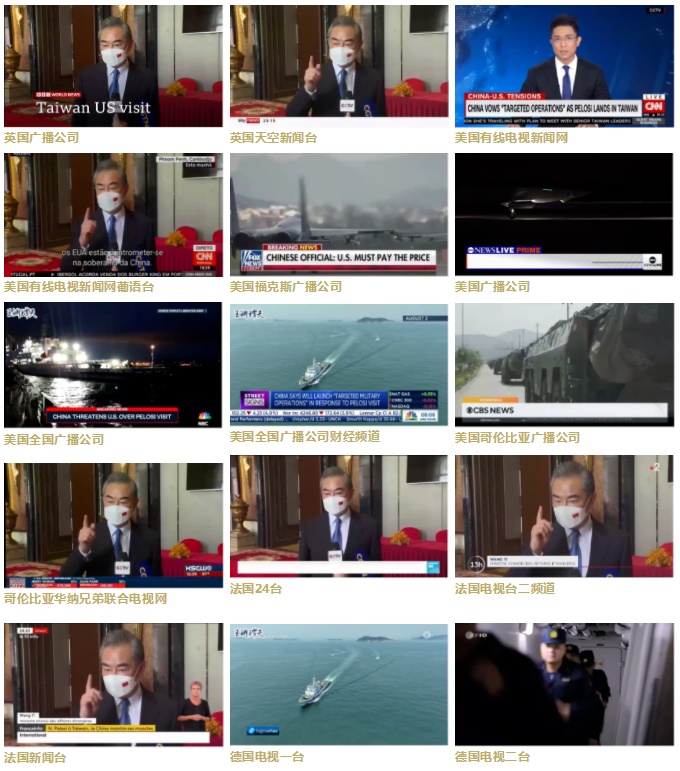 總臺國際視頻通訊社聚焦外交部、國臺辦、東部戰(zhàn)區(qū)等權(quán)威表態(tài),可視化制作編發(fā)《國際銳評》《玉淵譚天》等相關(guān)評論言論。截至8月4日10時,共有84條新聞素材得到BBC、CNN、CNBC、英國天空新聞臺、法國24臺、法國電視臺、法國新聞臺、德國電視一臺、德國電視二臺、德國之聲、意大利廣播電視公司、意大利TGCOM24電視臺、加拿大廣播公司、加拿大最大的商業(yè)電視網(wǎng)CTV、俄羅斯第一頻道、全俄國家電視廣播公司、日本NHK、韓國KBS、巴西環(huán)球電視臺、印度國家電視臺、新加坡亞洲新聞臺、澳大利亞廣播公司、卡塔爾半島電視臺、墨西哥阿茲特克電視臺、印尼國家廣播電視臺等102個國家和地區(qū)的1683個電視臺及新媒體平臺采用。國際視頻通訊社還特別面向中國臺灣地區(qū)的媒體進行精準投送,實現(xiàn)臺灣地區(qū)主流電視臺全覆蓋,落地效果突出:臺灣東森電視臺、臺灣無線衛(wèi)星電視臺(TVBS)、臺灣中華電視臺、臺灣中天電視臺等共有13個臺灣電視臺及采用播出744次,播出總時長3小時26分44秒。