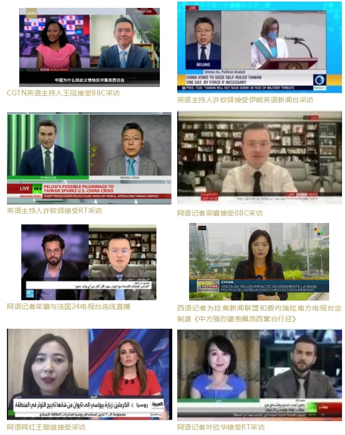 CGTN英、西、法、阿、俄等多語種主播、評論員和網(wǎng)紅積極在多家外媒發(fā)聲,接受了包括英國廣播公司(BBC)、今日俄羅斯(RT)、伊朗英語新聞臺(Press TV)、拉美新聞聯(lián)盟、貝寧E-TELE電視臺、法國24電視臺、沙特阿拉比亞電視臺以及以色列i24news電視臺等多家國際媒體的采訪連線,主動闡釋中方立場,分析佩洛西這一挑釁行徑背后的虛偽動因,揭批美國在臺灣問題上“說一套做一套”、侵犯中國的主權(quán)和領土完整的行為。